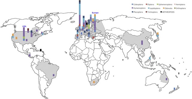 Talk about a Eurocentric paper. Any Biologist will tell you that most insect diversity is observed in the Tropics and yet the article’s data density in the Tropics is virtually non-existent. Looking in their Supplemental Data we find that the paper includes less than a handful of papers dealing with the Tropics.