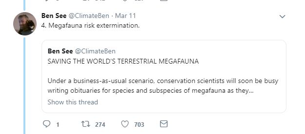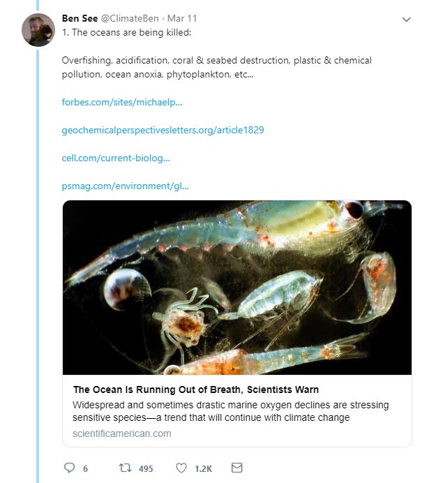 Looking at the references he uses to support his claim: the Forbes article is about overfishing; the Geochemical article is about microplastics; the Cell article is about ocean wilderness; and the PSMag article is about marine plastics. The one thing they all have in common is none supports Ben’s general argument that the “oceans are being killed“. They talk about risks to certain populations or sub-populations within the oceans but none of them support the general premise that the oceans will die in any real sense. They simply don’t support his wild rhetoric.