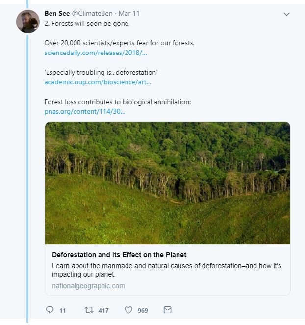 As for these citations: the Science Daily (20,000 scientists) article does not mention forests at all while the Academic.oup (Biosciences) is a particularly egregious misstatement. He presents the line “especially troubling is….deforestation” in his tweet; however this is another example of why ellipses are so often used by the unscrupulous. Here is the entire section in the original article: