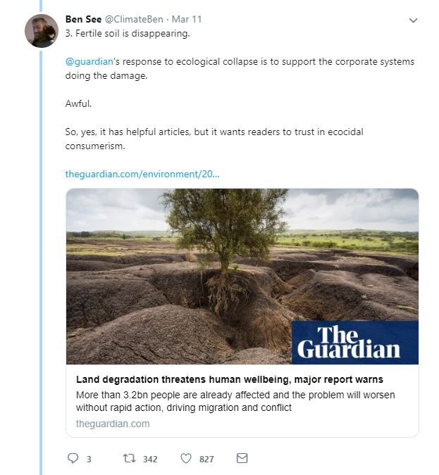 Now we all know that farming and land use practices have degraded our topsoil but Ben doesn’t even try to support his claim in this tweet. Instead he just provides a Guardian article that says that they aren’t doing enough to protect topsoil. It doesn’t back up his position that “fertile soil is disappearing” but any reasonable observer would have realized that this would be the case by now wouldn’t they? As a note, while the degradation of topsoil is a critical environmental concern, recent changes in farming approaches (like no-till farming) are making great strides in protecting our precious topsoil.