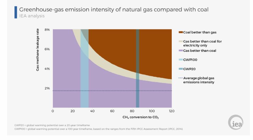 In this discussion of leaks the author is careful to to avoid using actual numbers. I can only guess this is because he doesn’t want you to know that his argument doesn’t hold water using what we know about fugitive emissions. The International Energy Agency has debunked his argument and even given us a nice graphic for typical natural gas facilities. As it makes clear at typical fugitive emission levels natural gas is better than coal in greenhouse gas intensity.