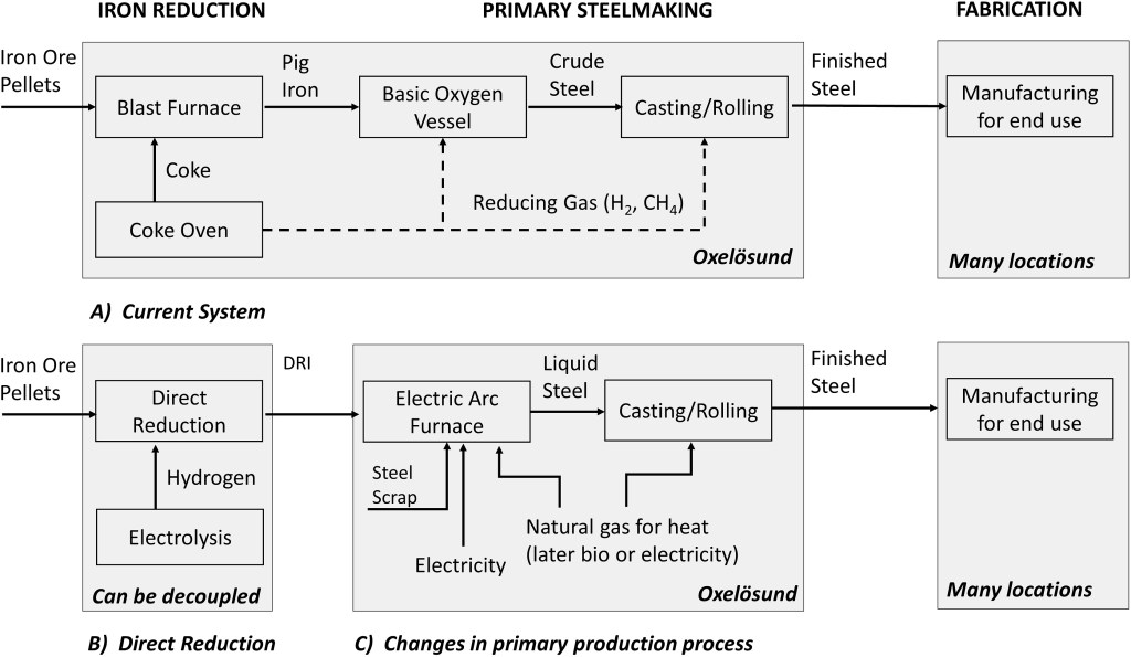 It is entirely clear that the authors don’t understand the use of hydrogen in “green steel”. In “green steel” hydrogen is used as the reducing agent (a chemical not a thermal step). It does so by replacing coke. In traditional steel-making coke serves two purposes to generate heat and in the reduction step. In green steel, electricity (or ironically natural gas) is used to generate the heat while hydrogen is used for its chemical properties only. To make this completely clear, in green steel the furnaces don’t burn hydrogen! There are no “state-of-the-art hydrogen-powered furnaces“. A graphic of the process (from the Kusnir et. al., paper discussed below) is presented here: