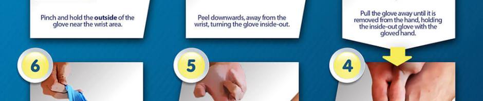 Since we have to assume the outside of our gloves are contaminated, we should change them regularly and need to ensure they are removed correctly. There is a correct technique to removing gloves, as depicted in the graphic below. If you don’t remove your gloves correctly then you will, once-again, defeat the purpose of wearing gloves.